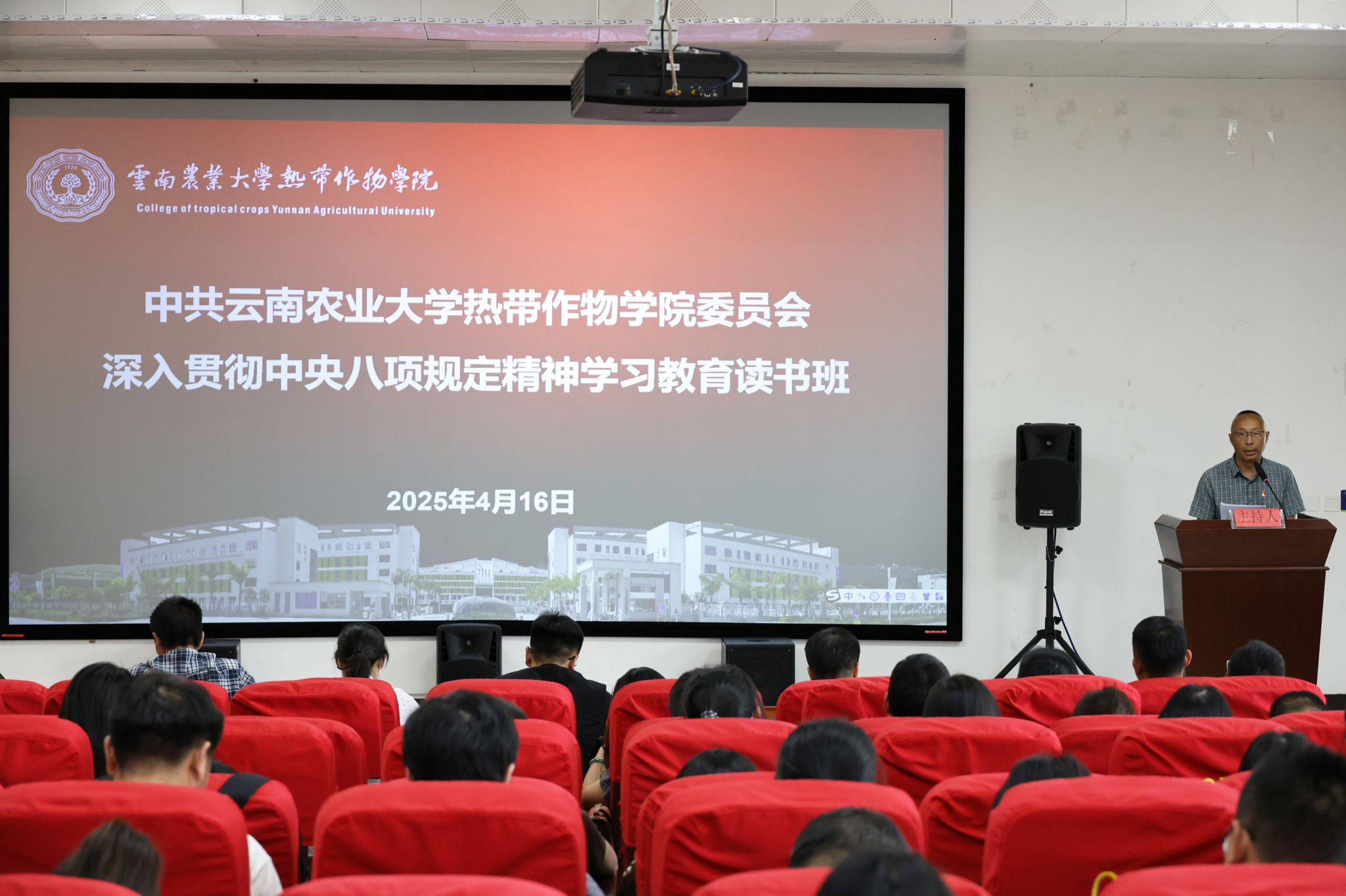 2025年4月16日,在深入贯彻中央八项规定精神学习教育读书班动员会上,热带作物bat365中文官方网站书记杜华波作开班动员讲话,并传达学校深入贯彻中央八项规定精神学习教育启动部署会议精神;纪委书记闫刚通报违反中央八项规定及其实施细则精神典型案例;党委组织员、工会主席周兴明组织学习《中共中央政治局贯彻落实八项规定实施细则》。