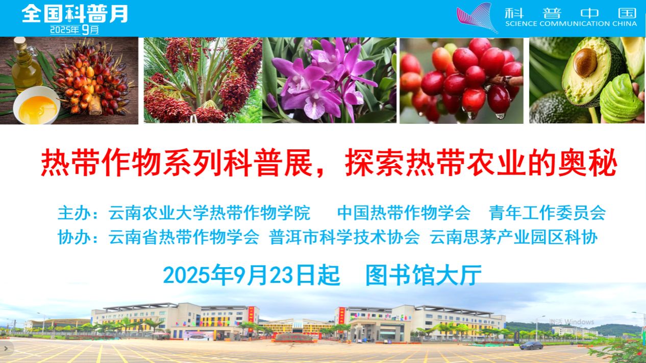 近日,“热带作物系列科普展”在bat365中文官方网站图书馆大厅正式拉开帷幕。此次展览由bat365中文官方网站、中国热带作物学会、青年工作委员会联合主办,云南省热带作物学会、普洱市科学技术协会、云南思茅产业园区科协、“科创中国”云南咖啡产业高质量发展科技服务团,以及科技赋能乡村振兴服务专项之云南澜沧拉祜族自治县咖啡产业项目共同协办,自 2025年9月23日起面向社会公众开放。