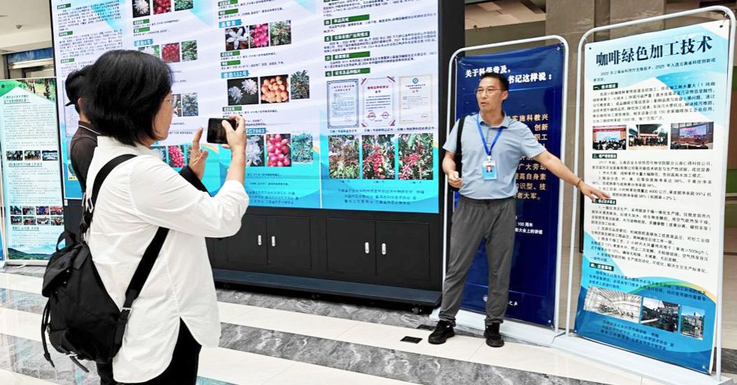 活动现场,学院的科普工作人员结合海报内容为参观者进行专业讲解,从具备高产稳产优势的“普咖1、2、3号”咖啡品种,到拥有优良特性的“热油2号”油棕品种,再到潜力十足的“攀育2号”芒果品种,科普人员用通俗易懂的语言拆解专业知识点,带领参观者深入了解热带农业领域的科研成果,沉浸式感受热带作物种植背后的科学魅力。