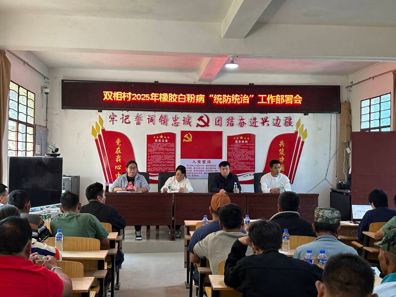双相村党委书记叶恩在会上传达了孟连县“统防统治”启动会议精神,并结合本村实际,从防治区域划分、人员分工及时间节点等方面对具体工作进行了安排部署。杜华波书记指出,白粉病是威胁橡胶树生长的关键病害,直接影响胶农收入。他强调,学院将以国家天然橡胶产业技术体系为依托,在双相村建设橡胶先进技术示范基地,推动病虫害防控技术落地,助力胶农增产增收,以产业振兴巩固脱贫攻坚成果。