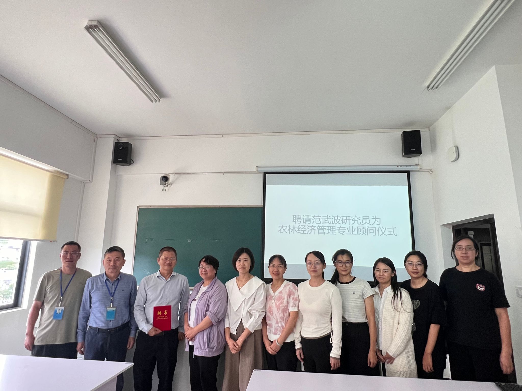 讲座尾声,范武波研究员介绍了“乐活产业”发展理念,分享业务沟通的不同版本技巧,并开放交流答疑。同时,经贸管理与信息技术系副主任吴光凤为范武波研究员颁发聘书,聘请范武波研究员担任农林经济管理专业顾问,并与农林经济管理专业教师合影。