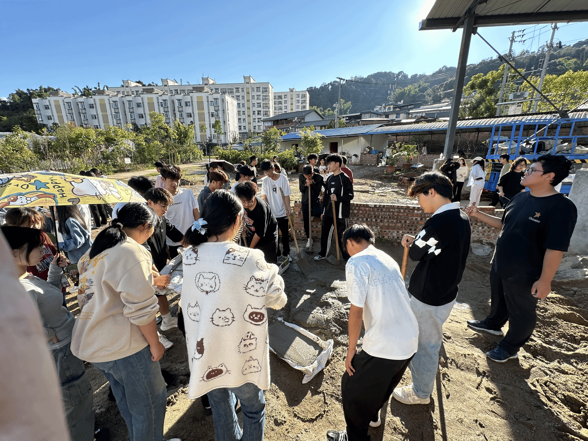 为了进一步加深风景园林专业学生对风景园林专业相关核心能力的掌握,深入践行学校培育高素质应用型人才核心导向,力促学生内化课堂所学,躬行实践、知行合一。我系风景园林专业教师程双红、王永林、依燕叫带领23级学生在校园内开展为期9周工程训练实训。该实训将风景园林工程、园林制图、园林规划设计实训和园林栽培养护实训等多学科有机融合。实训期间,老师和学生一起整地放线、挖地基、拌水泥砂浆、运水泥、铺石板、移植绿化、后期维护等,完整地体验了风景园林专业在实际岗位工作的每一个流程。