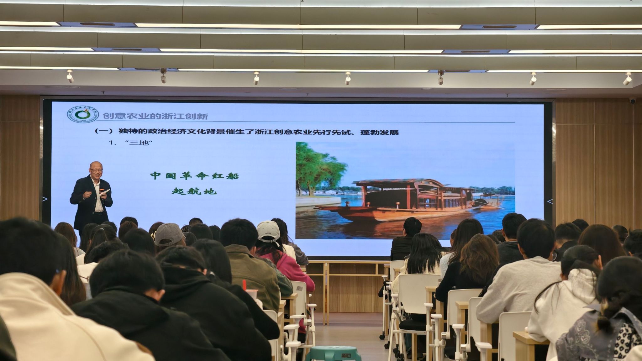赖齐贤研究员讲到“五养五创”——理念创新、科技创新、产品创制、模式创优、文化创建,提到落实两山理念、“千村示范,万村整治”、同时赖齐贤研究员分享了多个创意农业实例,分析创意农业组合模式,启迪了同学们的家国情怀,激励了学习的热情。讲座结束我院副院长李学俊老师向赖齐贤研究员和徐俊锋研究员颁发了客座教授证书。